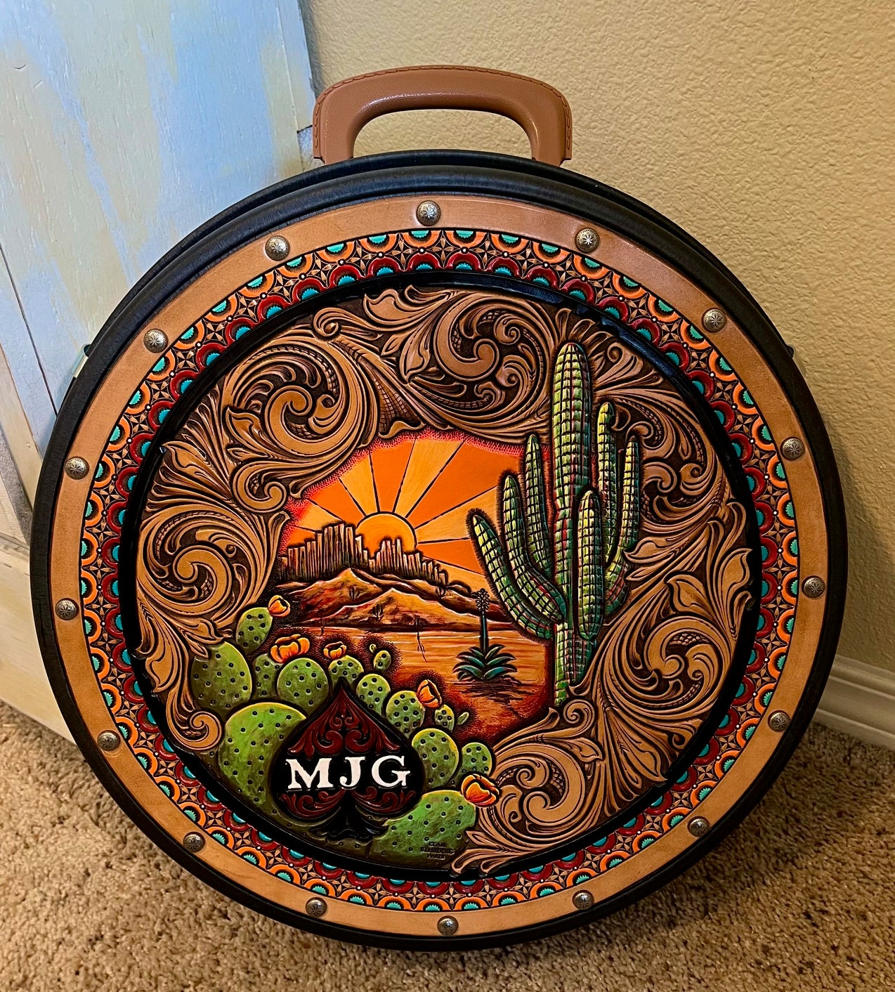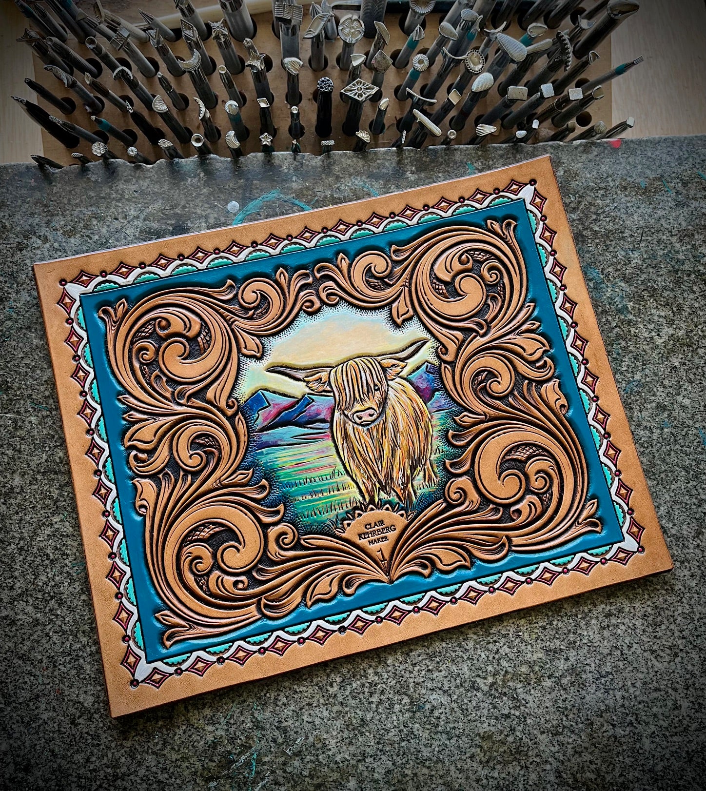 Clair Kehrberg is a master leatherworker, gear maker, and saddle maker. She grew up in eastern Oregon's ranch country near John Day, where she continues to ranch with her husband. Kehrberg was a baby the first time she was on a horse and grew up running cattle, working with horses, and doing a variety of ranch work. With a love of horses and generations of ranching in her family, Clair Kehrberg decided to become a Saddlemaker. Kehrberg apprenticed first with Tom Berry Custom Saddlery, a well-known saddle maker; she also learned from Dale Harwood, another well-known master saddle maker, and bootmaker Mo Welfl. Kehrberg attended Spokane Community College in Washington, a 2-year program in saddle making and leather work; her teacher there was Verlane DeGrange. After finishing up school with Verlane, she apprenticed Randy Severe in Pendleton OR. DeGrange, Kehrberg recalls, "was incredibly meticulous and she enjoyed the artistry... And from her, I would say, is where I really got my good foundation... [starting] with hand stitching. Once you mastered that, you moved up to machines stitching... Once you mastered that, then you were able to start stamping and tooling.” A methodical and “very good teacher,” DeGrange made sure that her students built saddles, they started by making “the patterns for every single piece that goes on [a saddle]." Kehrberg has made about 20 saddles herself, and each takes at least 2 weeks full-time to make. She made quite an elaborate saddle as a wedding present for her husband, but, after the birth of her daughter, she’s focused on smaller projects such as intricately tooled bags, wallets, plaques, purses, and earrings. She particularly enjoys making the large leather plaques (custom work) for mounting animal skulls. Clair Kehrberg, an experienced teacher, is extremely articulate about her craft, how she learned, from whom she learned, and the intricacies of leatherwork. In 2021, she became a master artist in the Oregon Folklife Network’s Traditional Arts Apprenticeship Program, for which she is mentoring her apprentice in the finer points of making and carving chaps, chinks, and other gear. Kehrberg creates her own designs, from sketching to completion of a piece. She sells on Facebook and Etsy as well as in local shops when they are open.