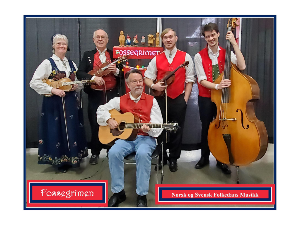 Fossegrimen, the Eugene-based 5-member folk dance group, is named for a Scandinavian waterfall-dwelling folk creature that teaches people how to play the fiddle. The band plays a variety of Nordic traditional melodies, folk tunes which have been transmitted through the years from musician to musician. Fossegrimen plays both gammaldans (literally 19th-century Nordic “old dances" such as vals, schottis/reinlender, masurka and polkas) and bygdedans (Norwegian village dances such as springars, gangars, polskar, and polsdans) as well as set dances and mixers known as runddansere or turdans. While most of the songs on Fossegrimen’s album "Vals til Claire" (2008) are from the 1700s and 1800s, the title track is an original written by David for Claire Elliker-Vågsberg. Fossegrimen provides the music for Scandinavian folk dances, weddings, festivals, and fairs. Also available from 2024 is Fossegrimen's newest CD: "Kjøkken Vals". This CD features all Norwegian themed dance tunes and can be ordered by writing to David's e-mail address.